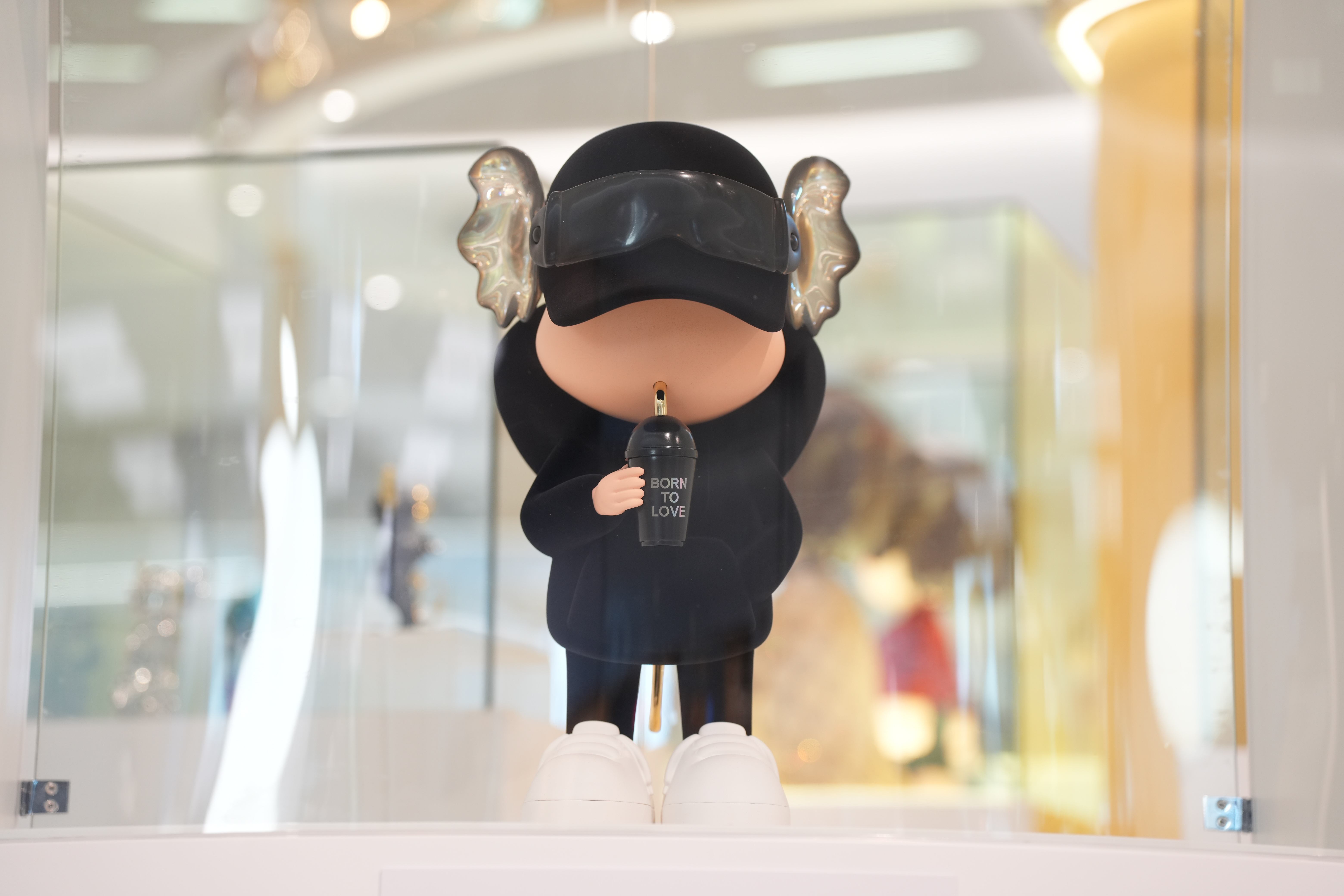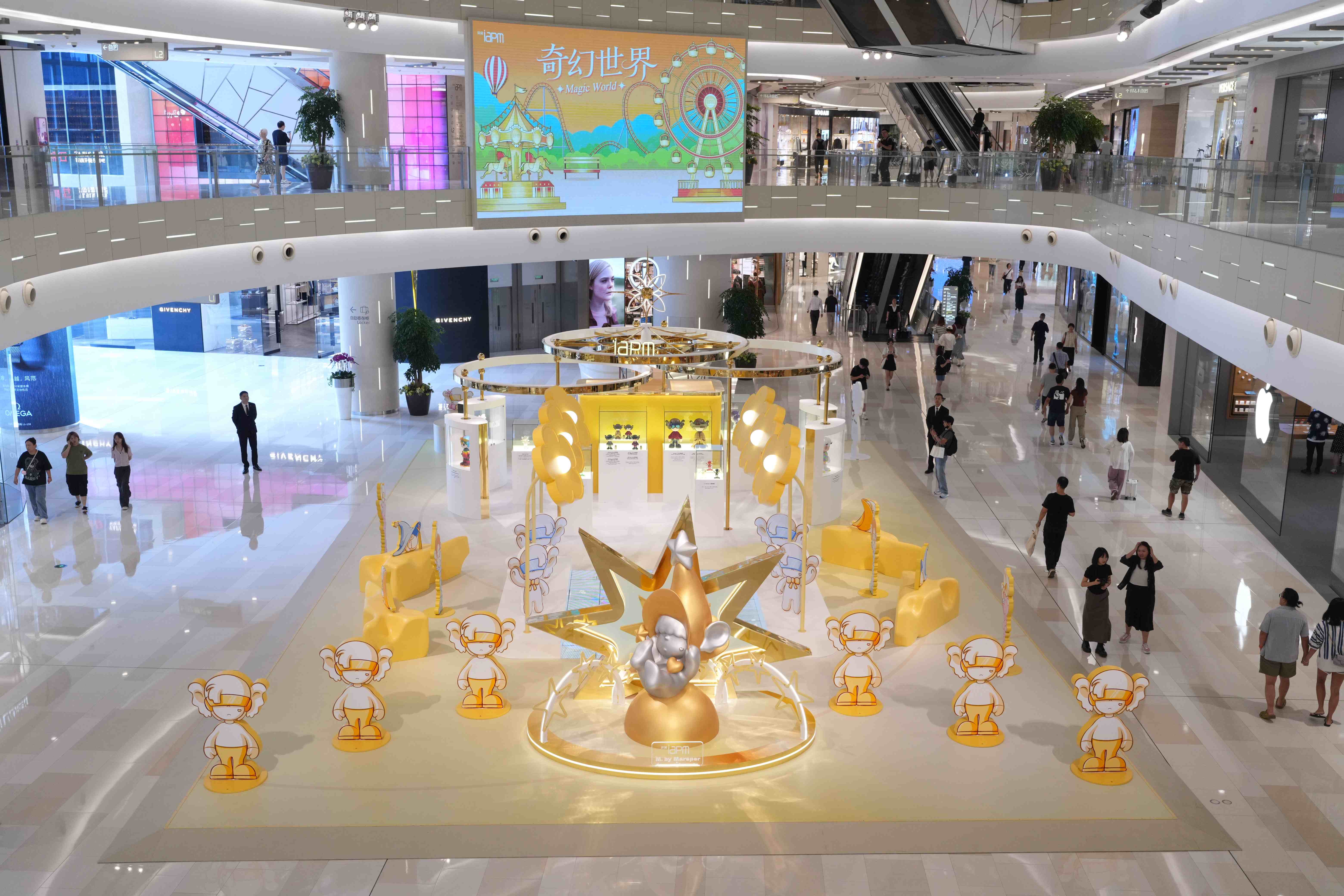 场景三梦环星座,Marsper静坐在简约白王座上,头顶三个圆圈交叠交织成图腾,顶端点缀星瓣,星辉与花瓣在光中交融。光影、图腾与Marsper交汇,仿佛沉入爱与魔法交织的梦境,成为这场潮流之旅的见证者。这里陈列着多款经典Marsper展品,涵盖品牌联名款、大师款、限定款等多个系列;场景四心星相映,在商场穹顶之下,两座5.5米高的Marsper悬浮空中。左侧俯卧柔粉巨型爱心,右侧戴星芒魔法帽、手举鎏金星星。驻足仰望,巨型身影兼具震撼与温柔,光影洒落地面,投下爱星交织图案。此刻立于爱与魔法交点,成为乐园中被温柔注视的主角。