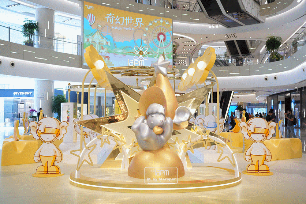 iapm奇幻世界 Magic World主题系列活动 正式启幕:场景一星境集结,在装置入口处,一座圆形平台之上,中央的Marsper伫立,身后一颗暖金色的巨型立体星星温柔发光,仿佛凝聚了整个宇宙的祝福。Marsper以“BORN TO LOVE 为爱而生”为核心理念,强调人类个体与社群皆因追寻与感知爱而变的不同。TA以潮流为载体,携手海内外不同领域艺术家探索爱的不同表达形式与意义,打开爱的全新视角。六体Marsper如守护使者般静立两侧。当你走近,仿佛与这群“为爱而生”的精灵并肩而立,在星光与潮感环绕中完成一场充满温度的集结,成为这场纯粹爱意中不可或缺的一部分。在规定时间内参与打卡可获得限定版Marsper纪念卡片一张!每日还有限定金卡放出,数量有限送完为止!