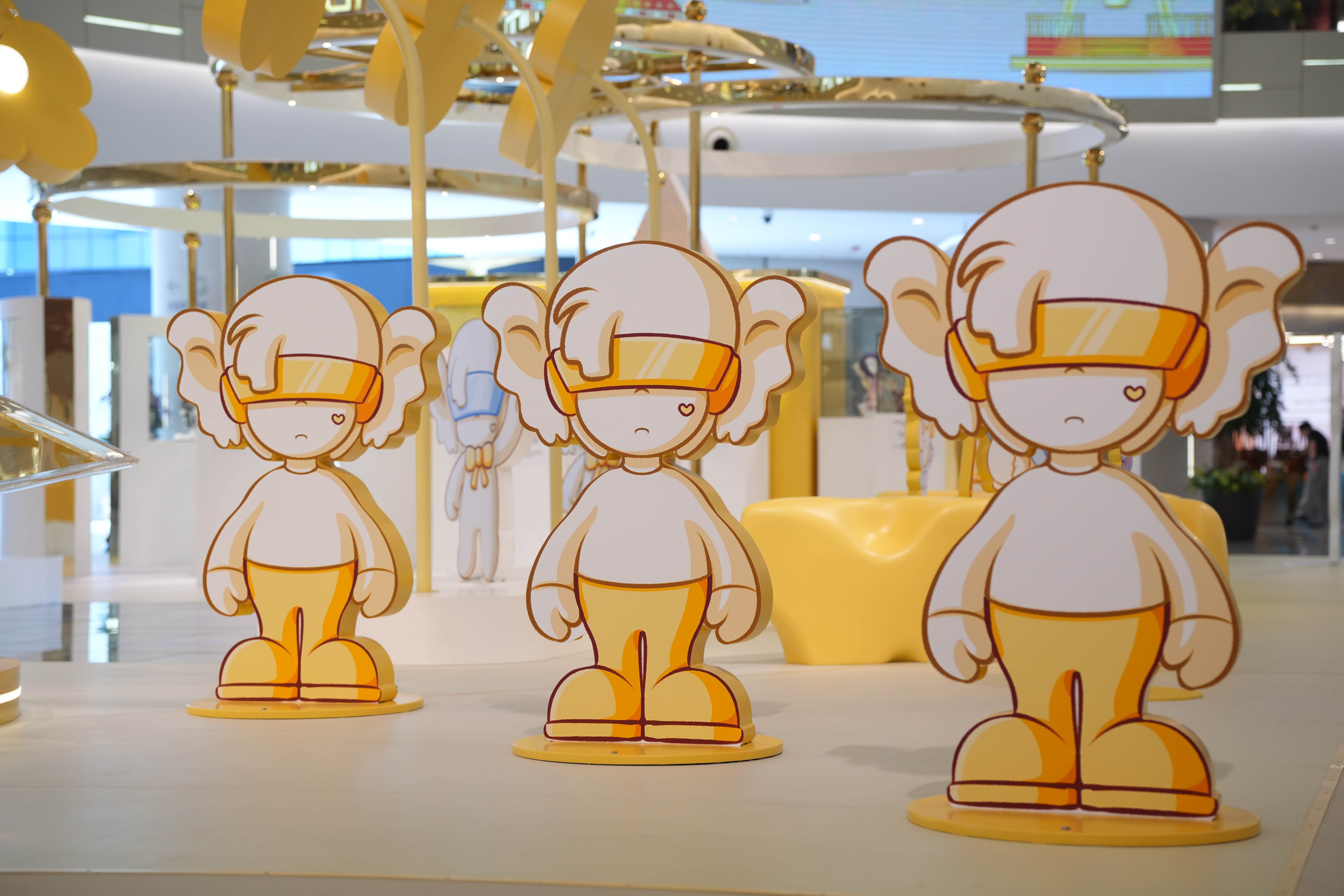 场景二花瓣迎梦,步入纵深处,一条花瓣廊道温柔展开。脚下的LED屏如流动的魔法画布,每一步都能踩出细碎星光。廊道两侧,八朵淡黄色花朵静立,花茎弯向中央似暖黄羽翼,每朵花外侧都立着一只造型各异的Marsper公仔,身姿与花茎相依而立,如同打造梦境的魔法精灵。而站立在仿真奶酪上的蓝黄双色公仔裹着缀饰的魔法帽,灵动又可爱,化身 “潮酷守护者”。踏入廊中,星光漫过奶酪底座,瞬间被这份藏着细节的温柔包裹,跌进爱与魔法交织的潮酷氛围里。