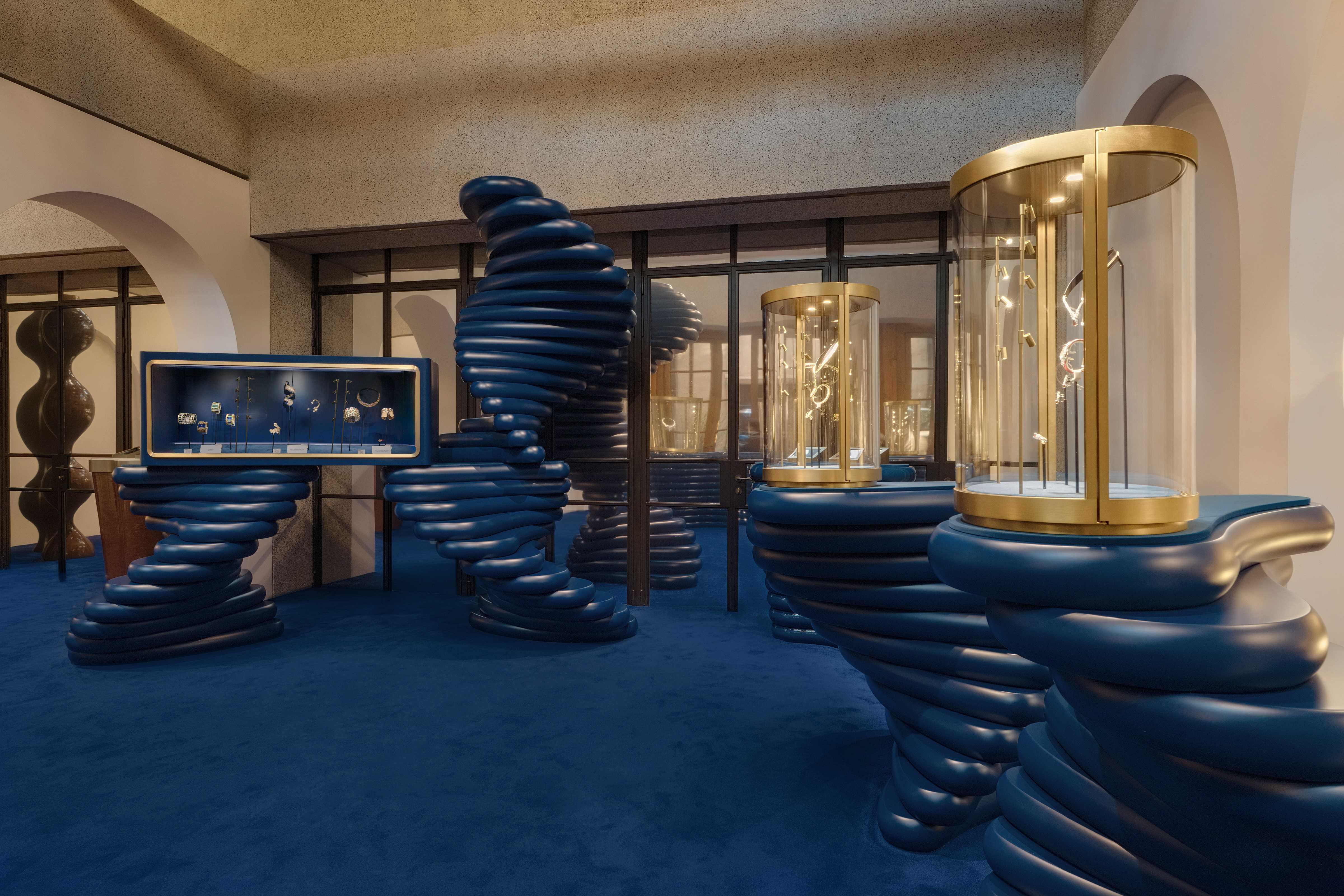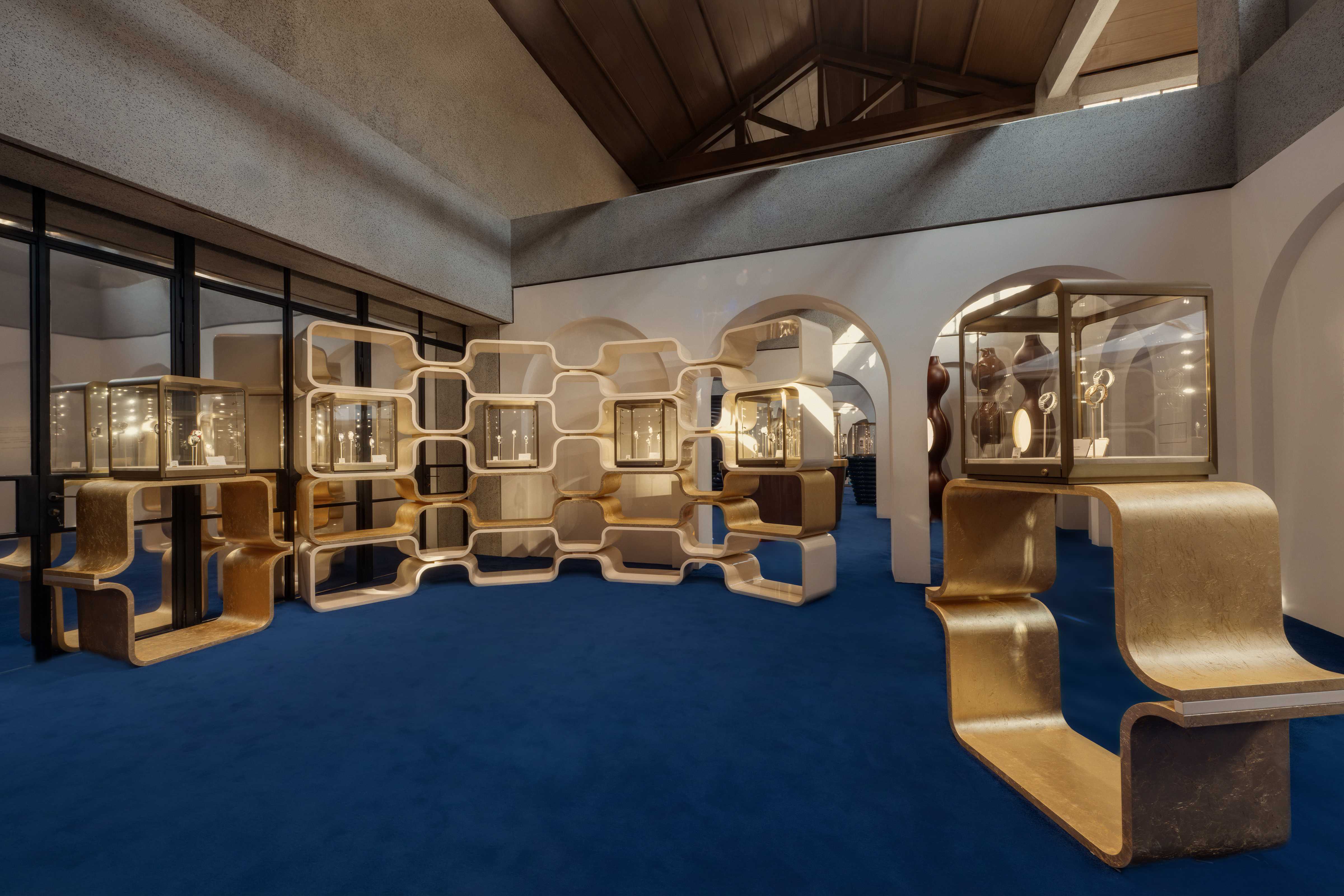 步入此主题展区,参观者仿佛受邀进入一个私密而奢华的名流雅聚。空间内布置有蓝色的旋转装置,其设计灵感源自法国的塞特小镇(Sète)层级而上的自然风光, 同时也是向20世纪80年代克劳德·蒙塔纳(Claude Montana)推出的经典香水的瓶身造型致敬,浓厚的复古风格跃然眼前。在安逸与欢愉交织的氛围中,再现PIAGET伯爵多年来凝聚全球创意精英与品味名流的独特生态。